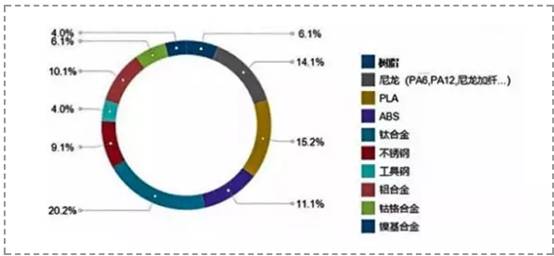 材料是增材制造技术发展的重要物质基础,材料的性能决定了增材制造能否有更广泛的应用。发展至今,增材制造的材料种类已从过去的塑料成型扩展到了树脂、石墨、陶瓷、金属以及有机生物材料。根据3D科学谷的市场调研,当前中国增材制造市场在树脂、尼龙、PLA、钛合金、不锈钢等材料的需求上占主导地位。
