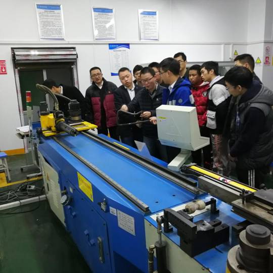 此次培训为供应商二次培训,主要针对初次培训后,学院教师在使用中出现的问题进行针对性的现场指导,从而使教师对设备的使用性能和操作流程更加熟悉。培训重点在数控弯管机、数控液压折弯机、剪板机、压力机和激光切割机等几个大型设备上。培训工程师详细讲解了各个设备的用途和操作流程、参数设置、控制界面、注意事项等关键内容。