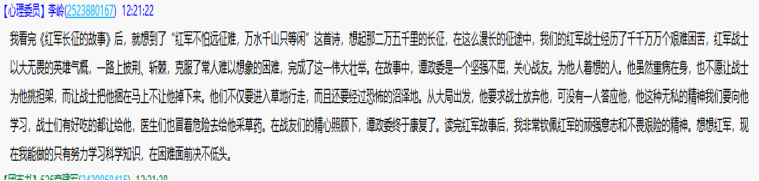 在此次主题班会通过ppt,视频材料,团支书给大家讲解了红军长征中发生在红军战士中的感人故事,抗美援朝战争中邱少云的感人事迹,以及投身到新中国建设之中的科学家们的故事。他们为祖国做出了巨大的贡献,面对困难,毫不畏惧,迎难而上,这些品质是值得我们这些后辈去铭记,去学习,去赞美歌颂的。历史之所以存在,就是为了让我们总结过去,解开现在的疑惑。温故红色记忆,传承爱国情情怀是我们每一个中国人必须要做的。