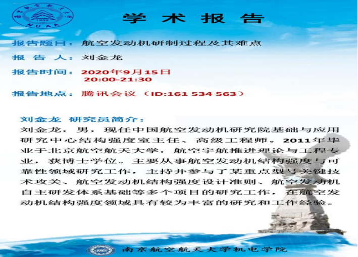 (本网讯 图文/陈玉飞)为激发大学生的创造力和想象力、增强大学生学习航空航天知识的学习热情、培养造就“大众创业、万众创新”的生力军、促进“互联网+”新业态形成、服务经济提质增效升级;以创新引领创业、创业带动就业、推动高校毕业生更高质量创业就业,航空航天工程学院于2020年9月15号组织《刘金龙学术报告》线上学习活动。本次活动面向航院全体学生,活动由教务科吴红红老师主持。