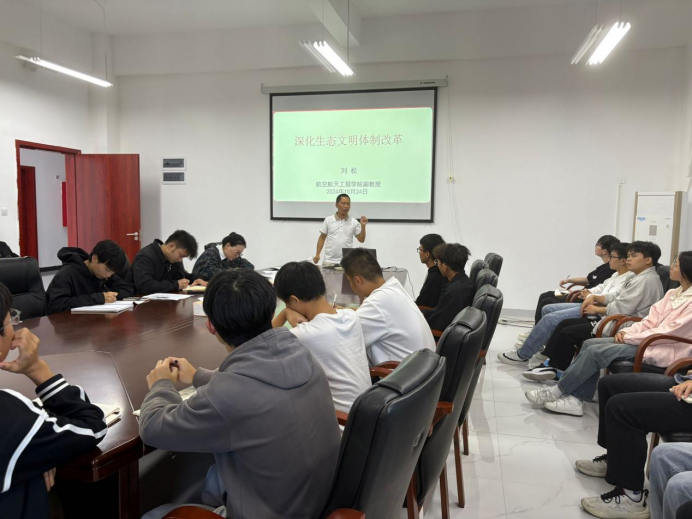 本网讯(文/陈云   图/胡云燿)为深入学习贯彻党的二十届三中全会精神,10月24日下午,航空航天工程学院刘松老师在睿知楼527会议室召开“学习贯彻党的二十届三中全会精神——深化生态文明体制改革”宣讲报告会,学院团总支(学生会)、学生党支部全体成员参加。