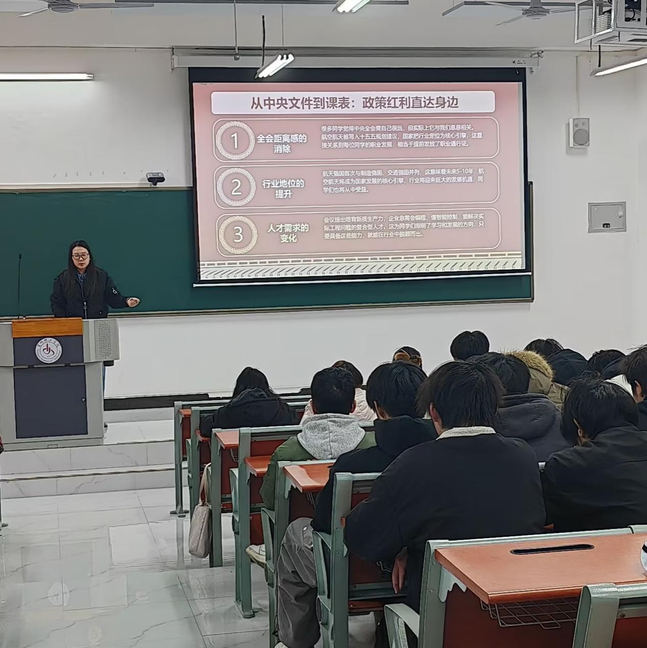 (本网讯 图、文/谭又铭)2025年12月10日,航空航天工程学院辅导员于茂竹在B01-113教室,为2023级、2025级同学带来“逐梦蓝天:党的二十届四中全会精神与航空青年使命”主题宣讲,让全会精神精准对接青年学子成长发展。