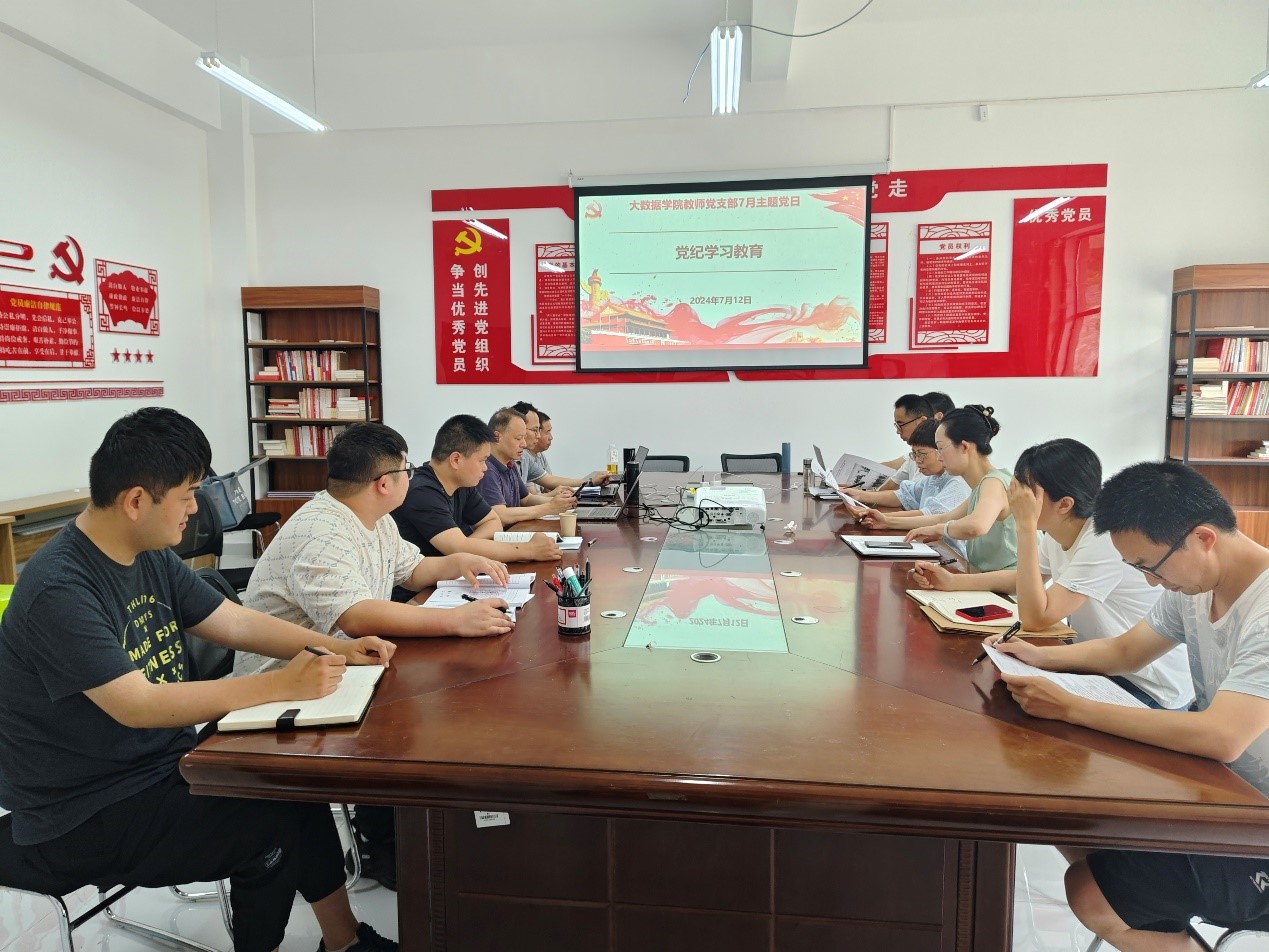 本网讯(大数据学院 文/王喜宾 图/严凯 杨楠)7月12日上午,大数据学院教师党支部在党员活动室开展“党纪学习教育”主题党日。支部书记杨楠同志主持,支部党员参加会议。