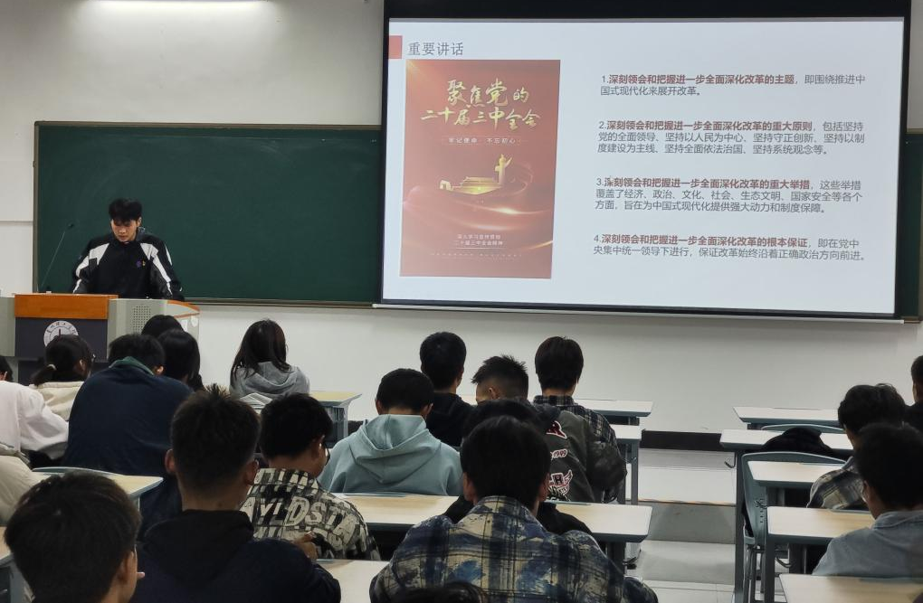党员宣讲团成员陈佳佳、王安粒、温思睿、陈浩、李伟分别在2024级新生班级开展宣讲。通过观看视频、提问、讨论等形式,结合自身学习体会,宣讲党的二十届三中全会精神,进一步明确青年学子的责任和使命,号召同学们努力学习、积极进取、勇于担当,在全面建设社会主义现代化国家伟大征程中书写更加辉煌的篇章。