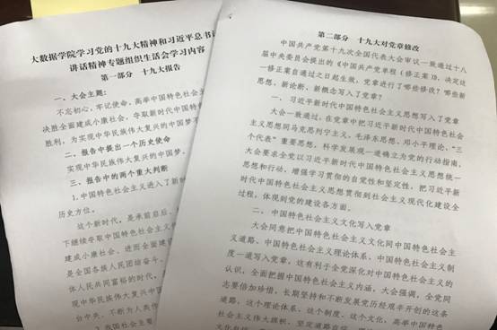 2017年11月22日下午,大数据学院组织党员学习党的十九大报告精神、传达认真学习贯彻习近平总书记在贵州代表团的讲话精神习近平总书记在贵州省代表团的重要讲话。