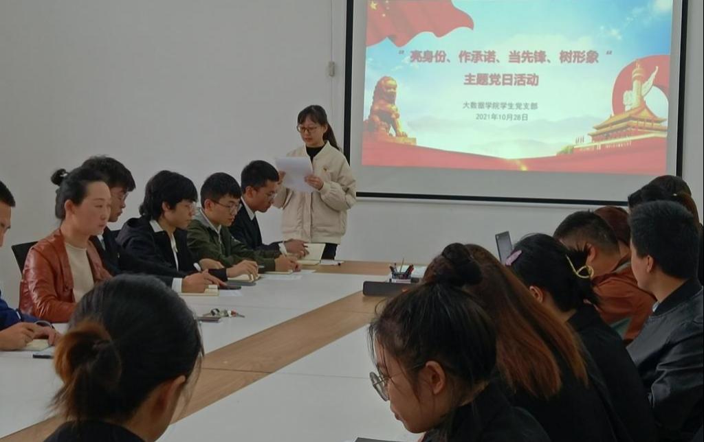 本网讯(文/刘智海 图/学生党支部)为进一步推动全体学生党员亮身份、树形象、作表率,充分发挥学生党员的先锋模范带头作用,2021年10月28日,大数据学院学生党支部在学院会议室G3522开展“亮身份、作承诺、当先锋、树形象”主题党日活动。党总支书记张艳列席指导,支部全体党员参加,支部书记石春梅主持会议。