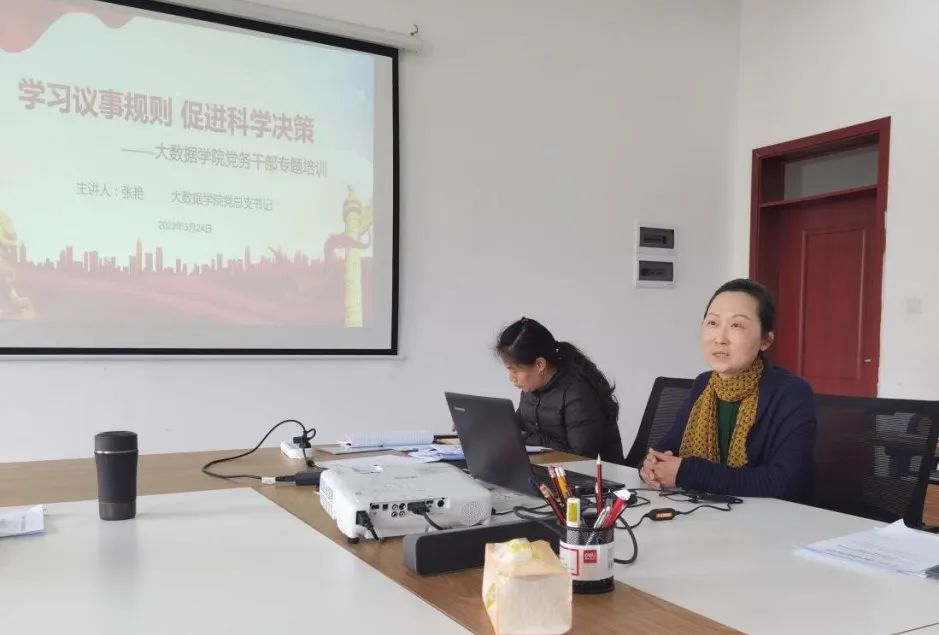 本网讯(图/文 石春梅)2022年3月24日下午,大数据学院党总支举办主题为“学习议事规则 促进科学决策”的党务干部专题培训。党总支委员、支部书记和支委、各科室负责人、慧科集团负责人参加,党总支书记张艳同志主讲。