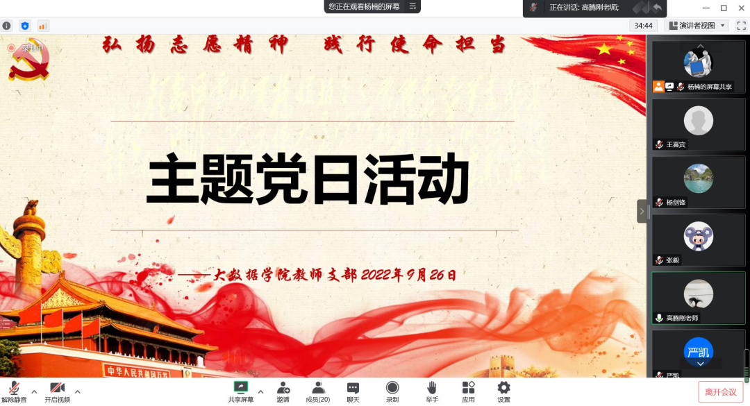 本网讯(图/文 王喜宾)9月26日下午,大数据学院教师党支部在线开展“弘扬志愿精神 践行使命担当”主题党日活动。会议由支部书记杨楠主持,支部全体教师党员参加。