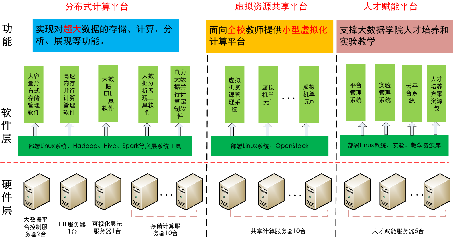 大数据计算中心包含31台服务器,存储和处理数据能力量达PB级。根据当前学校教师科研、教学的需要,该中心主要划分为3大平台,包括分布式计算平台(16台)、虚拟资源共享平台(10台)、大数据人才赋能平台(5台),当前拥有各类大数据容量为TB级。