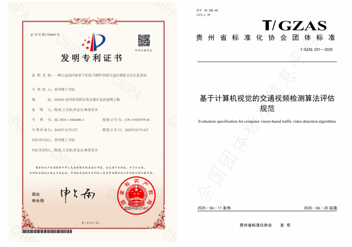 制定并发布了《基于计算机视觉的交通视频检测算法评估规范》(团体标准 T/GZAS 031—2025),为行业评测提供统一依据;形成知识产权组合:该项目获发明专利授权1项、受理1项,软件著作权2项,发表高质量学术论文2篇。