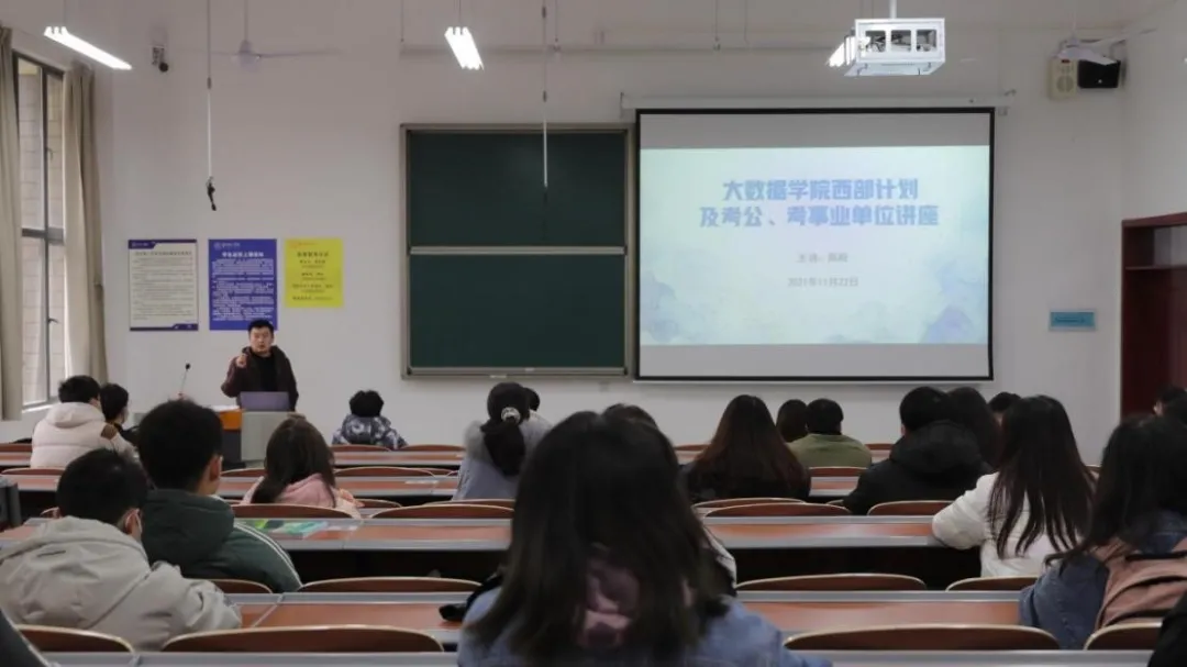 本网讯(大数据学院 文/陈阳 图/陈雨婷)2021年11月22日中午,在开物楼G1108多媒体教室,团总支副书记陈盼面向大数据学院学生开展“西部计划及考公、考事业单位”主题宣讲。宣讲以线下、线上相结合的方式进行,共计四百余名同学参加了讲座。