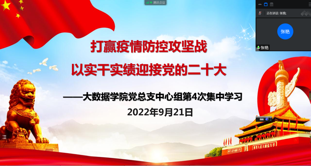 本网讯( 图/文 石春梅)2022年9月21日,大数据学院党总支理论学习中心组通过腾讯会议开展第四次集中学习,主题为“打赢疫情防控攻坚战 以实干实绩迎接党的二十大”。党总支委员、各科室负责人、师生党支部书记参加学习,党总支书记张艳主持。