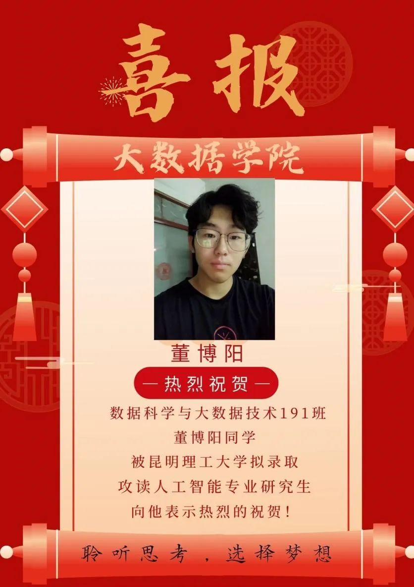 本网讯(文/董博阳 图/董博阳 李贵)在2023年全国硕士研究生招生考试中,大数据学院数据科学与大数据技术专业191班董博阳同学拟录取昆明理工大学,特发中国足球彩票:表示热烈祝贺!