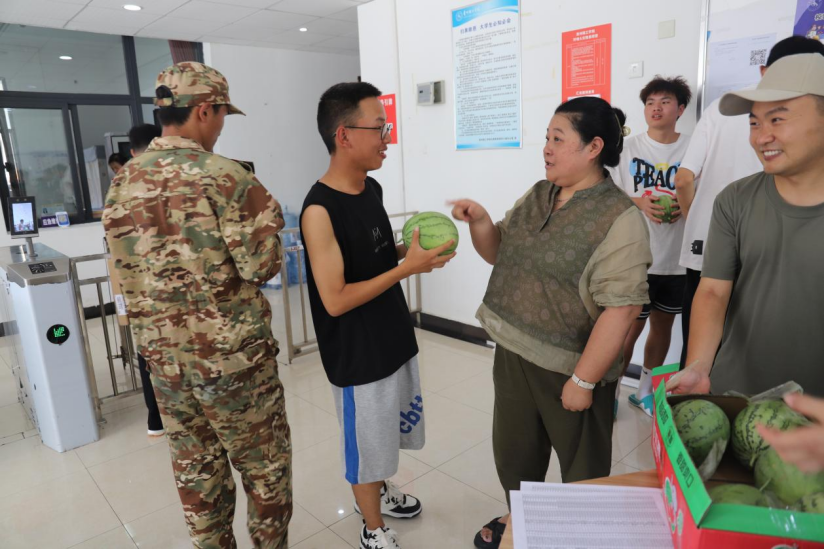 慰问活动中,大数据学院还贴心地为每一位新同学送上解暑西瓜,鼓励同学们继续保持大数据学子的昂扬精神风貌,努力锻造铮铮铁骨。学院还对辛苦承训的武警官兵们表示了感谢。