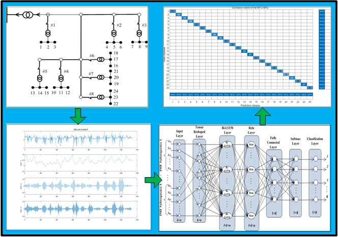 随着分布式能源和非线性负荷在智能电网中的广泛应用,电网中的谐波污染问题日益复杂化。准确、高效地识别谐波源对于明确责任归属、追踪谐波污染源头以及控制谐波传播具有重要意义。为此,杨仁增博士团队提出了一种创新的配电网谐波负荷智能识别方法。该方法基于IEEE Std. 1459-2010瞬时功率理论,结合变分模态分解(VMD)和算术优化算法(AOA),通过双向长短期记忆网络(Bi-LSTM)或门控循环单元(GRU)进行谐波负荷的智能识别。通过优化VMD参数,提取谐波功率序列的关键特征,并利用多模态特征组合机制,显著提高了识别精度。实验结果表明,该方法在识别谐波负荷方面表现出色。与传统的时序神经网络识别模型相比,团队提出的MFC-Bi-LSTM/MFC-GRU模型在识别精度、鲁棒性和收敛速度上均有显著提升。即使在低信噪比(SNR)环境下,仍能保持高精度的识别能力,显示出良好的抗噪声干扰性能。