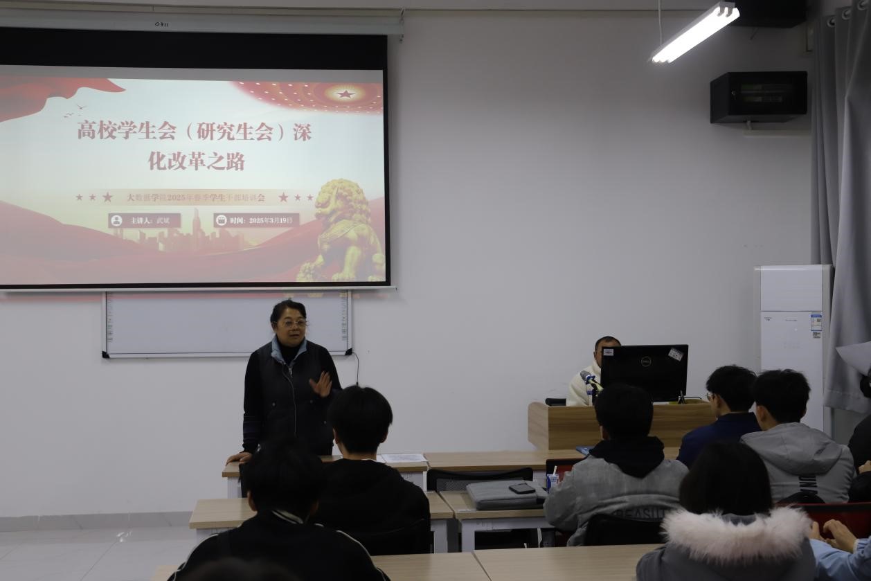 本网讯(大数据学院 文/图 余圣城)为深入学习贯彻习近平新时代中国特色社会主义思想,落实深化高校学生会改革的相关文件精神,引导学生干部牢记使命与担当,2025年3月19日晚,大数据学院在睿知楼404教室召开春季学期学生干部培训大会。学院党总支副书记武斌到会指导并领学,全体团学组织成员参会。