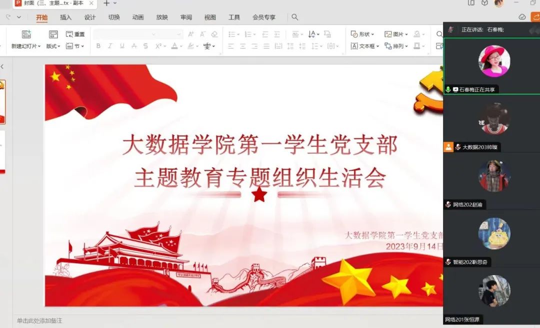 本讯网(图/张扬璐 文/石春梅) 9月14日,大数据学院第一学生党支部通过线上线下相结合的方式,召开主题教育专题组织生活会。党总支副书记武斌到会指导,支部书记石春梅主持会议,支部全体党员参加。