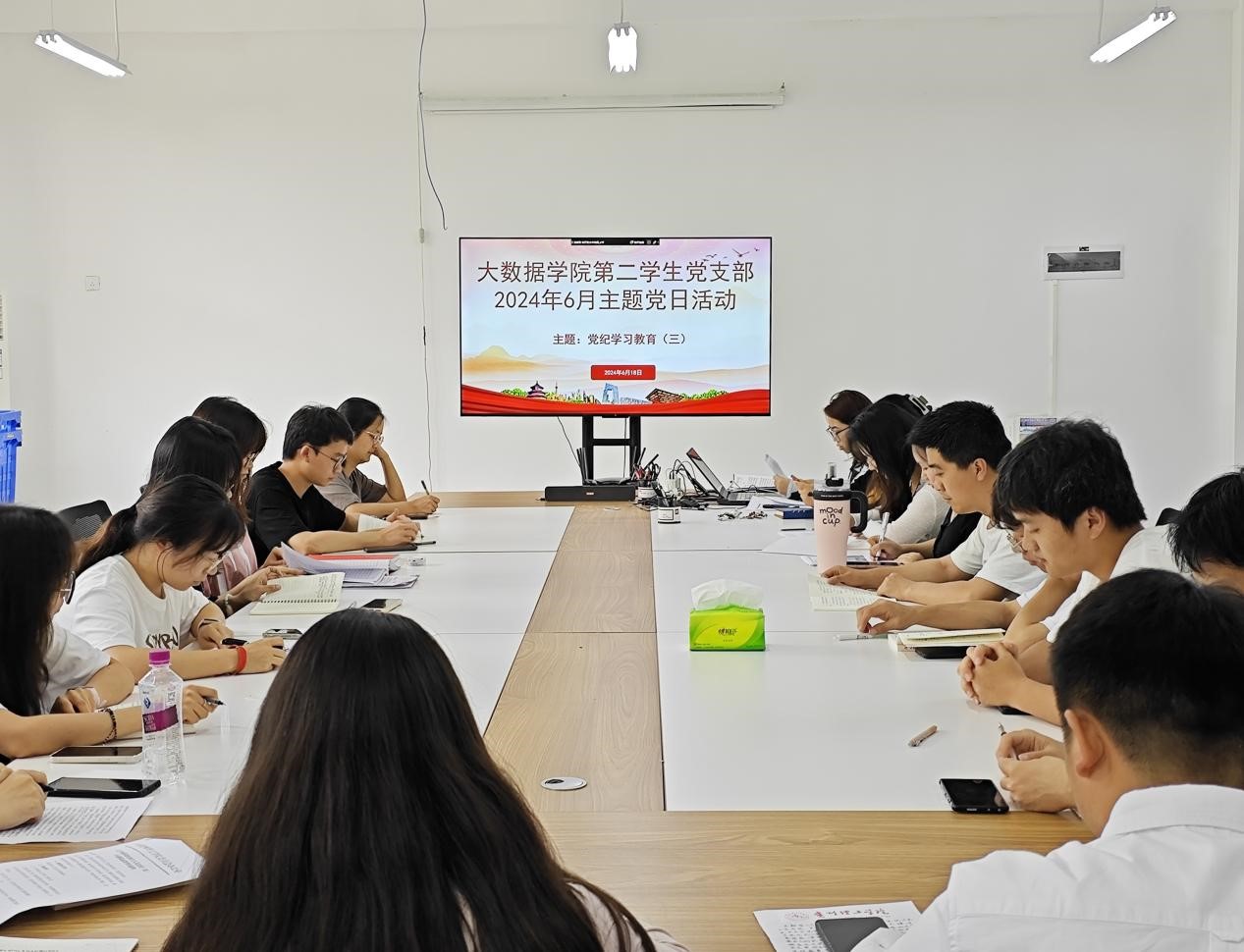 本网讯(大数据学院 文/魏良月 图/赵金美)6月18日,大数据学院第二学生党支部在睿知楼510会议室开展“党纪学习教育”主题党日。支部书记孙秋韵主持,支部全体党员参加。