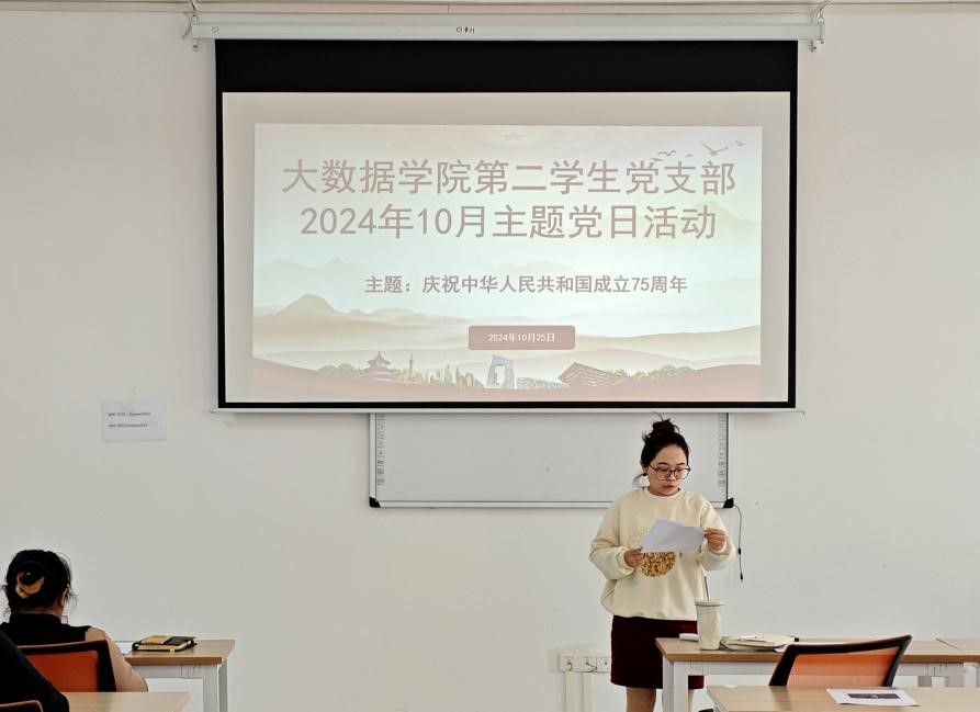 本网讯(大数据学院 文/刘阳平 图/赵金美)10月25日,大数据学院第二学生党支部在睿知楼404教室开展“庆祝中华人民共和国成立75周年”主题党日。支部书记孙秋韵主持,支部全体党员参加,发展对象列席。