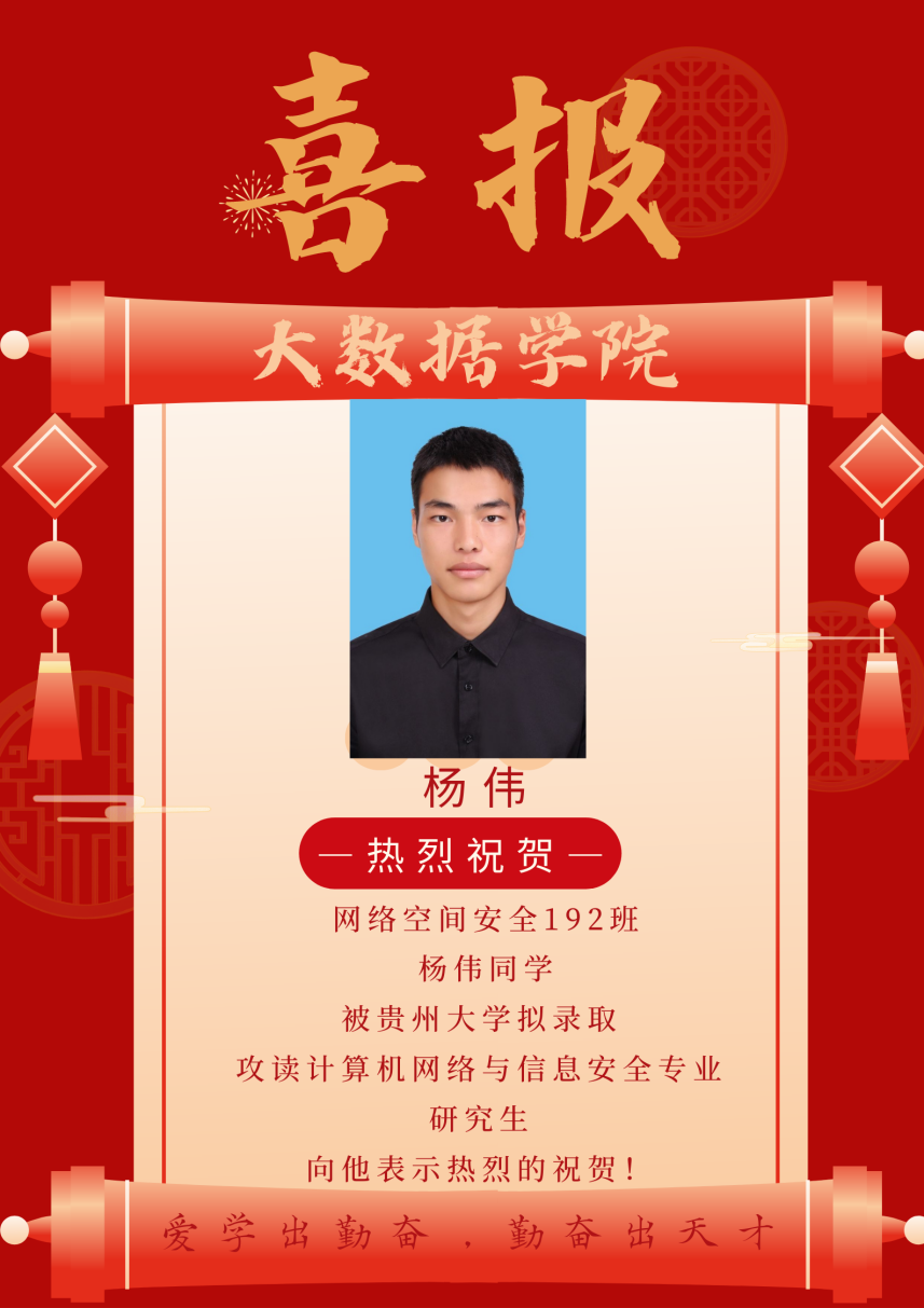 本网讯(文/杨伟 图/杨伟 李贵)在2023年全国硕士研究生招生考试中,大数据学院网络空间安全专业192班杨伟同学拟录取贵州大学,特发中国足球彩票:表示热烈祝贺!