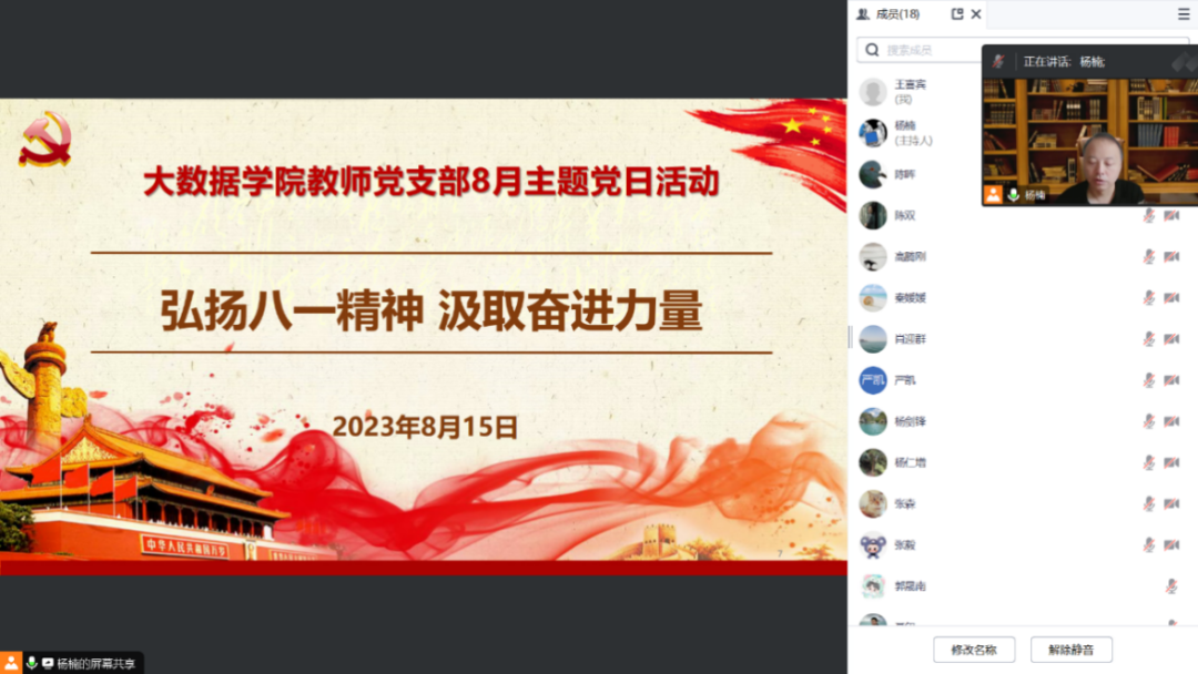 本网讯(文/图 王喜宾)8月15日下午,大数据学院教师党支部在线开展题为“弘扬八一精神 汲取奋进力量”主题党日活动。教师党支部全体党员参会,支部书记杨楠主持会议。
