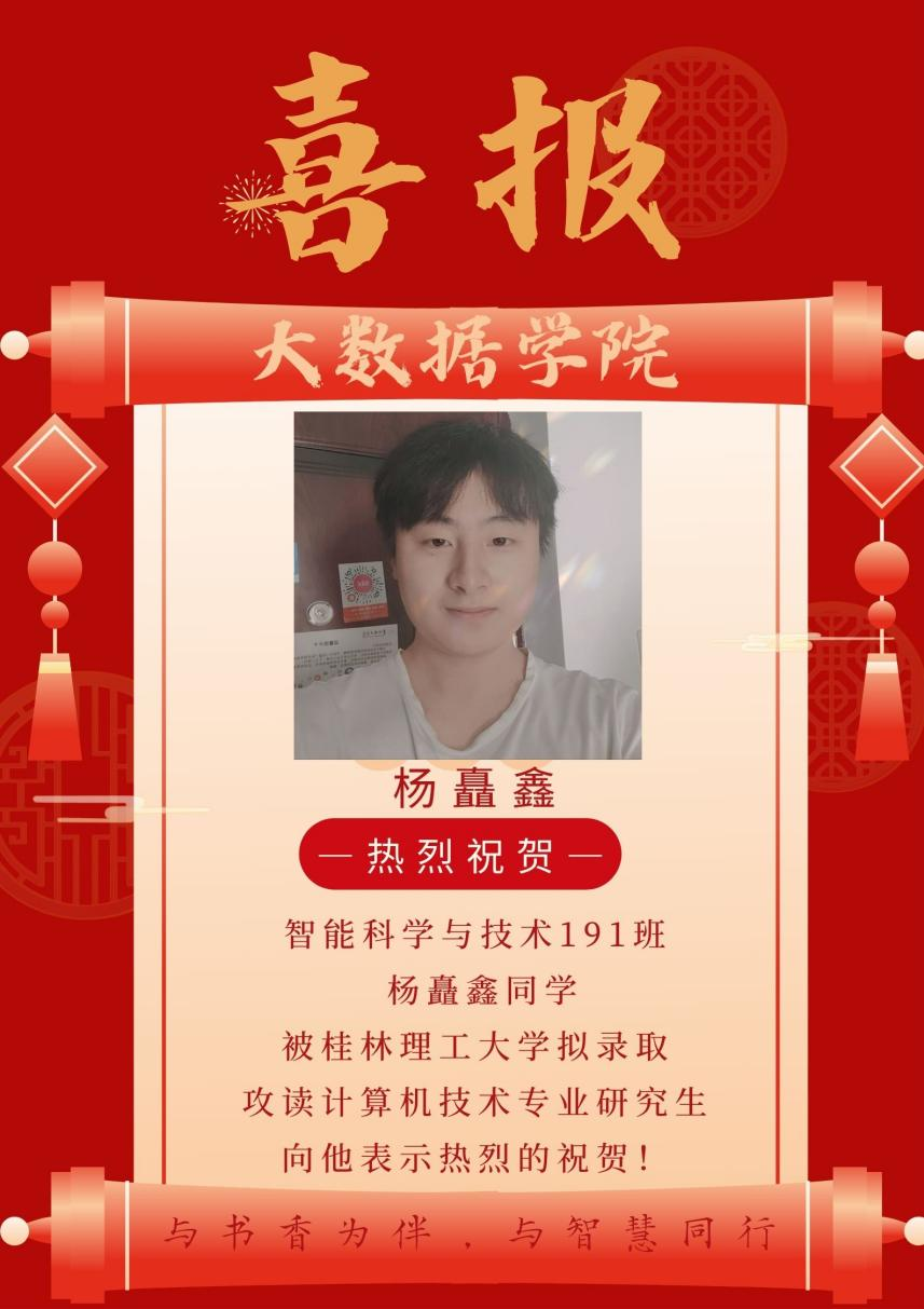 本网讯(图/杨矗鑫 李贵 文/杨矗鑫)在2023年全国硕士研究生招生考试中,大数据学院智能科学与技术专业191班同学杨矗鑫拟录取桂林理工大学,特发中国足球彩票:表示热烈祝贺!