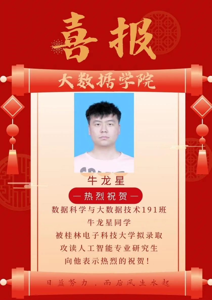 本网讯(图/牛龙星 李贵 文/牛龙星)在2023年全国硕士研究生招生考试中,大数据学院数据科学与大数据技术专业191班牛龙星同学拟录取桂林电子科技大学,特发中国足球彩票:表示热烈祝贺!