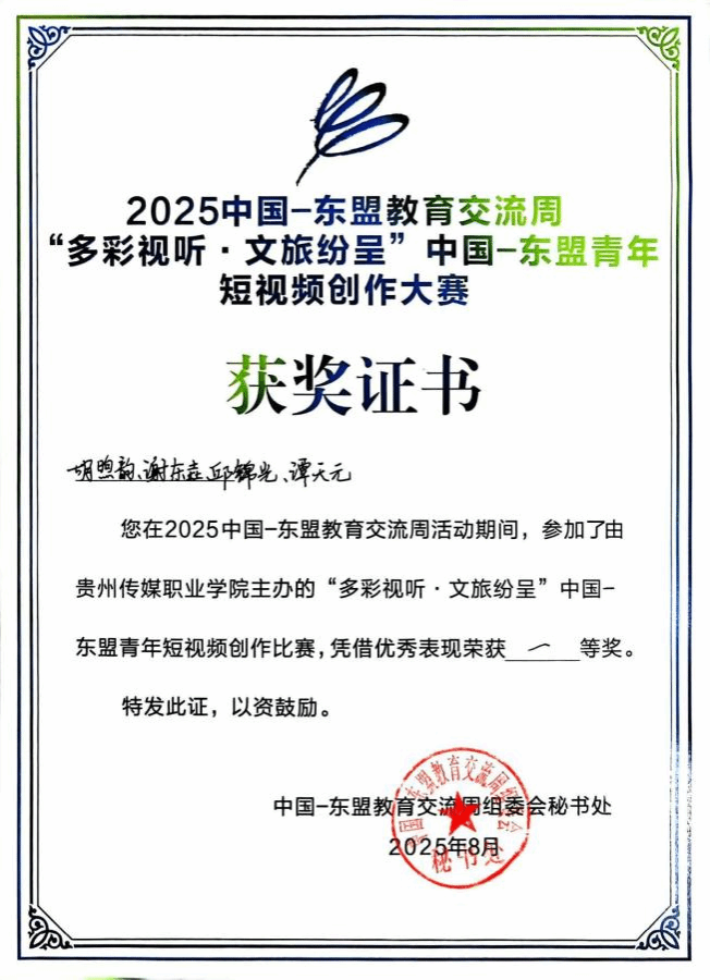 大数据学院两支暑期“三下乡”队伍的3个作品参赛并获奖。其中胡熙韵小组作品《非遗之美,侗族大歌的发展与传承》获一等奖、蒋泽忙小组作品《肇兴古韵,锦绣侗乡》获二等奖、朱桂瑶小组作品《踏寻红色足迹,传承长征精神》获三等奖。参赛团队以影为媒,深入挖掘并展现侗族大歌、肇兴侗寨、石阡红色旅游资源的非凡魅力,让多元文化通过镜头得以生动呈现,助力中国与东盟及“一带一路”国家的文化传播与青年交流。