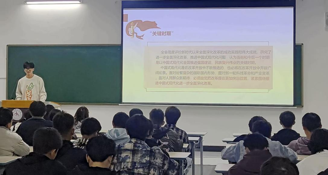 党员宣讲团成员陈佳佳、王安粒、温思睿、陈浩、李伟分别在2024级新生班级开展宣讲。通过观看视频、提问、讨论等形式,结合自身学习体会,宣讲党的二十届三中全会精神,进一步明确青年学子的责任和使命,号召同学们努力学习、积极进取、勇于担当,在全面建设社会主义现代化国家伟大征程中书写更加辉煌的篇章。
