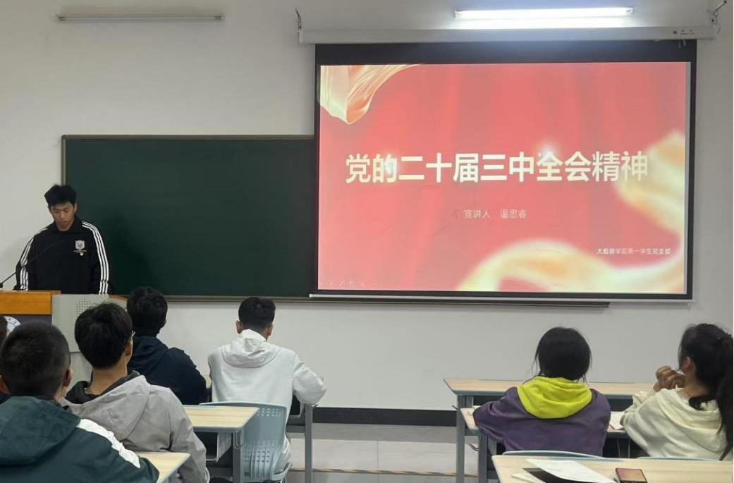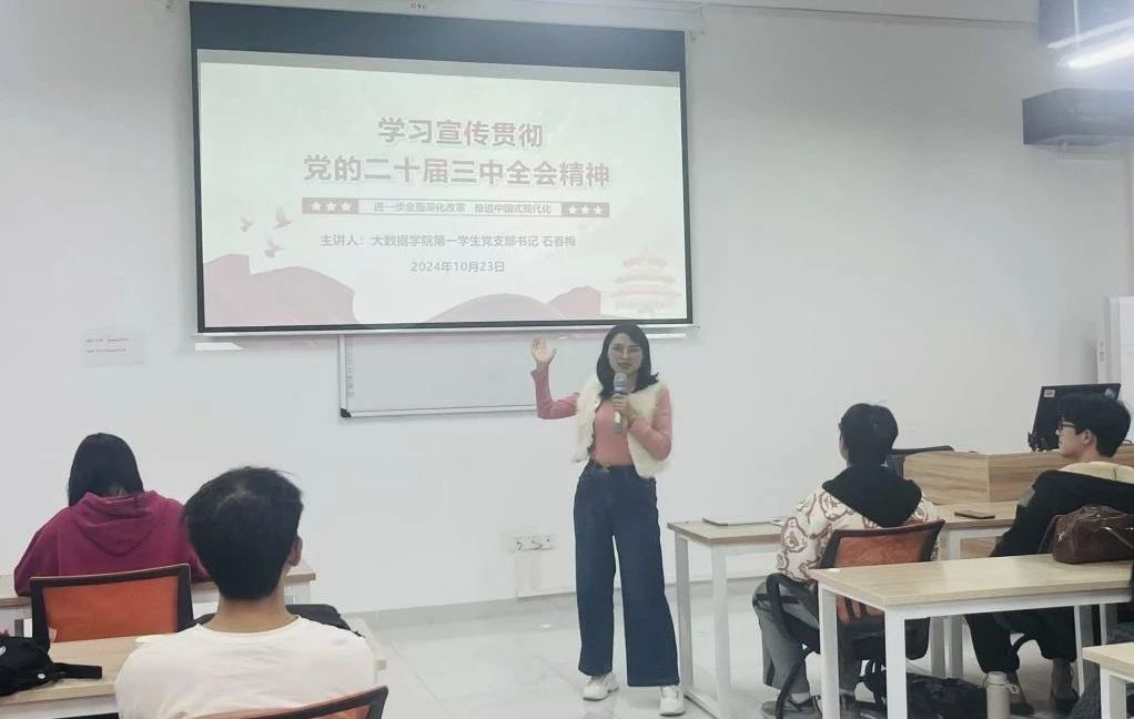 本网讯(大数据学院 文/图 贺于恒)近日,大数据学院第一学生党支部党员宣讲团组织开展“党的二十届三中全会精神”宣讲,支部党员、入党积极分子及2024级新生共300余人参加。