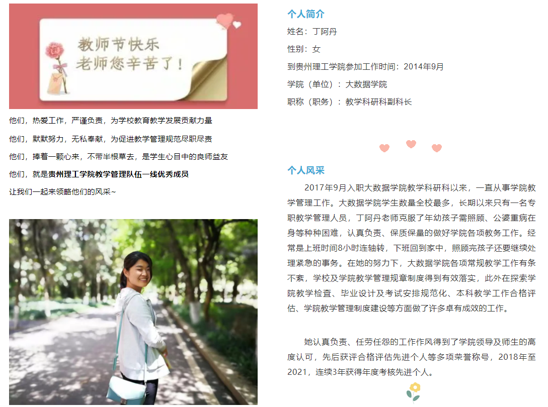 本网讯(大数据学院 秦媛媛)9月10日,正值第37个教师节,大数据学院王喜宾老师喜获贵州理工学院优秀教师荣誉称号,受到学校表彰。丁阿丹老师被评为2021年贵州理工学院优秀教学管理人员。
