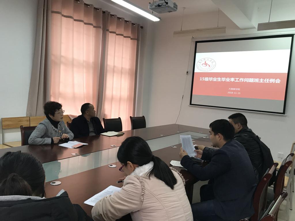 大数据学院认真落实校主要领导和学校2015级毕业生毕业率工作会议要求,于11月15日中午组织毕业班级的班主任、辅导员及教务科等共7人,就做好本学院2015级毕业生毕业率工作进行布置安排。