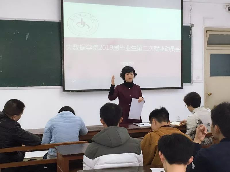 为加快推进我院2019届毕业生就业,帮助学生树立正确的就业观、择业观和创业观,大数据学院于2019年4月4日上午在三教309D召开了第二次就业动员大会。院党总支书记唐丽华、副书记史明华、网络工程教研室负责人王喜宾、辅导员蒋昀瑶、孙秋韵老师,2015级各班班主任及2015级在校同学参加了本次就业动员大会。