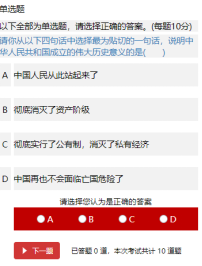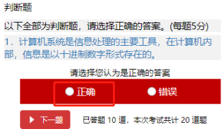 (一)在开始答题时,选择对应的答案后,会自动到下一题,也可以点击下面的下一题,但是不能返回上一题修改,只有在做完所有题目之后,才可以检查或者修改答案。