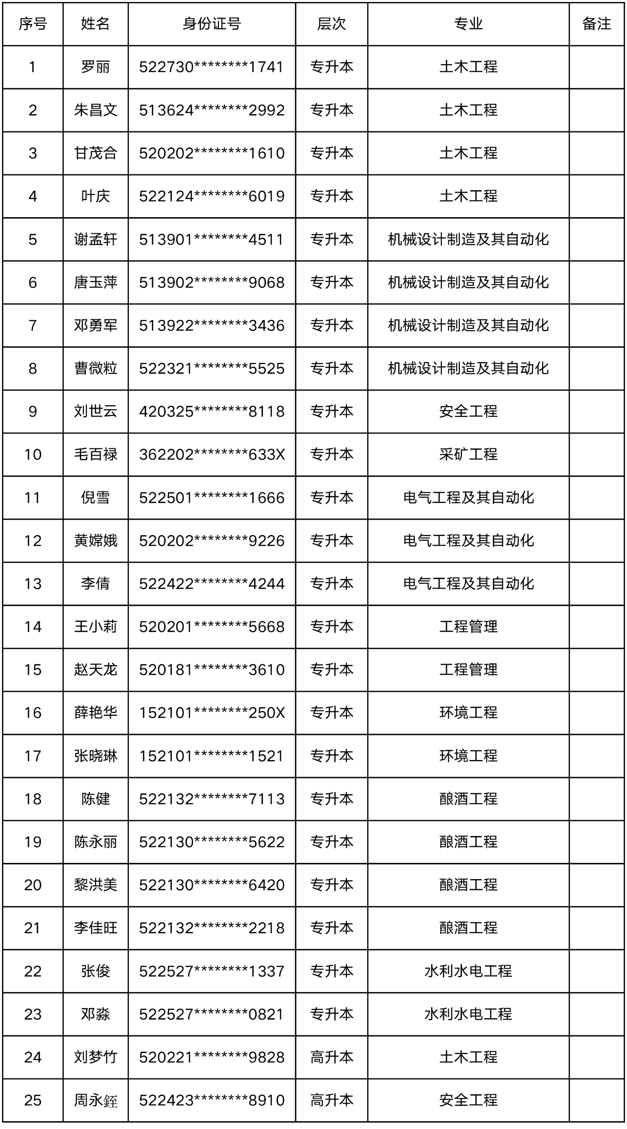 根据《贵州理工学院成人高等教育优秀学生评选实施方案》的评选标准,各专业都涌现出一批品学兼优的学生,为表彰先进,树立典型,弘扬正气,经学院评选管理工作小组审核评定,共评定出贵州理工学院成人高等教育2022级优秀学生25名。现将名单予以公示如下: