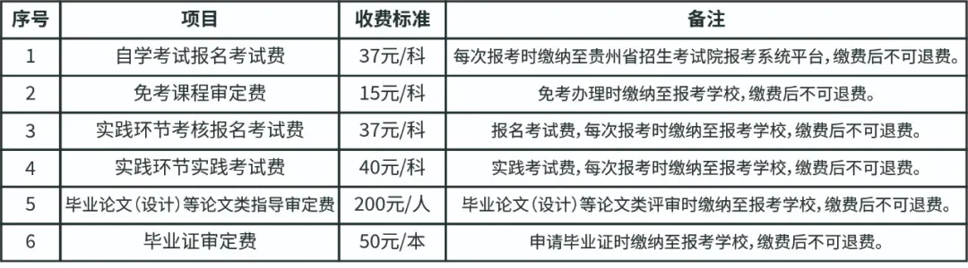 学费标准按照《贵州省教育厅贵州省物价局贵州省财政厅中国足球彩票高等教育自学考试社会助学收费标准的批复》(黔教计发〔2004〕98号)文件的有关规定执行。