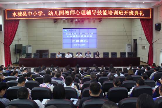 2015年7月20日上午8:30,水城县中小学、幼儿园教师心理辅导技能培训班开班典礼在水城县第八中学艺术中心举行。贵州理工学院继续教育学院院长李辅敏教授、党总支副书记刘路宁、水城县教育局副局长李德福以及相关领导出席了开班典礼,本次共有340名学员参加培训。