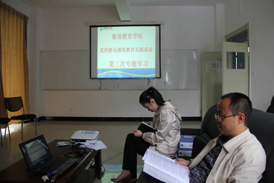 2014年4月21日,继续教育学院全体党员、教职工在成教大楼301会议室开展了第三次“群众路线教育实践活动”专题学习会议。会议由继续教育学院党总支书记赵荣祥主持。
