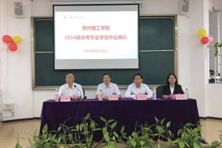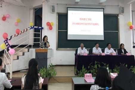 本网讯(继续教育学院 卢源源/文 卢源源/图)6月25日上午,贵州理工学院继续教育学院在学院307教室举行了“青春风华,记忆留夏”为主题的2014级自考毕业、离校学生毕业典礼。分管校领导梁杰副校长、继教学院院长李辅敏、党总支书记仇念华、副院长肖利平和全院教职工、班主任参加了典礼。典礼由仇念华书记担任主持。