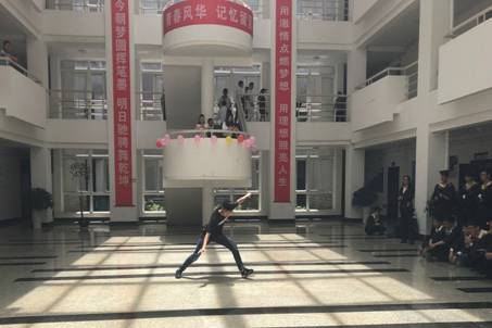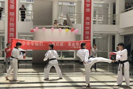 毕业典礼师生合影后,毕业班同学以高难度的街舞表演助兴,学弟学妹们为即将踏上新征程的学哥学姐们献上了精彩的跆拳道表演,节目赢得了师生们阵阵喝彩和雷鸣般掌声。