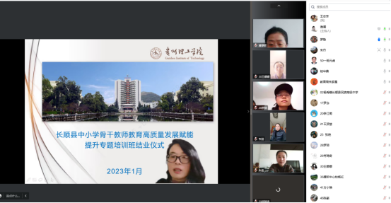 2023年1月11日至12日,由贵州理工学院继续教育学院组织举办的长顺县中小学骨干教师教育高质量发展赋能提升专题培训圆满完成,培训以线上的方式举办。贵州理工学院继续教育学院院长陈筠出席开班仪式并致辞,长顺县人民政府督学朱家星发表培训动员讲话。