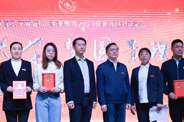 2023级工程管理专业新生代表陈家红发言,教师代表黎书文老师为新生代表佩戴校徽,并寄语2023级全体新生。