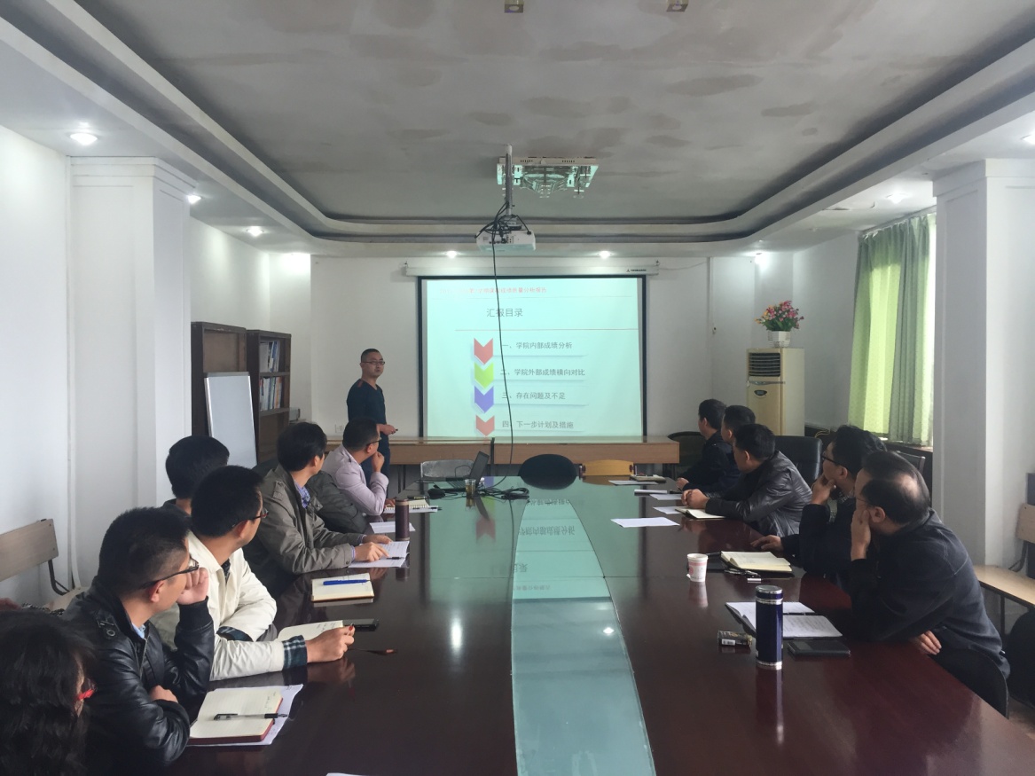 首先,采矿教研室副主任李海军老师代表学院做了汇报。他针对不同的课程分别从学院内部各班之间的平均分、挂科率、排名等方面进行了对比分析,同时对该门课程在全校的成绩分布和排名情况进行了横向分析对比。通过采用图表、线形图、柱状图等形式形象直观的展示了各班的成绩变化趋势等。通过纵向、横向的综合比较,对我院取得了显著的教学成绩的同时也指出了各学科与其他学院的差距,并对存在的不足进行了深刻剖析,提出了下一步整改设想。