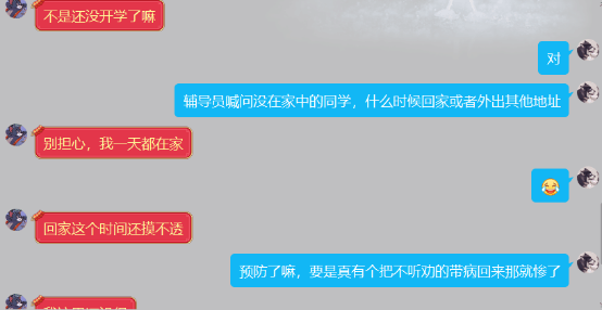 作为一名班干,我们是学生和学院的桥梁,传递着上面的精神也关注着同学情况,从1月22日开始,我就按照学校的要求,开展对班级同学的信息排查工作,对同学们的假期活动、身体状况进行排查。尽管大部分同学在得知疫情后选择了在家待着并没有出去,但有些同学在疫情之前就已经外出务工或者旅游等,了解他们的信息更需要全面及时,以便应对突发情况,这也成为我的工作重点之一。