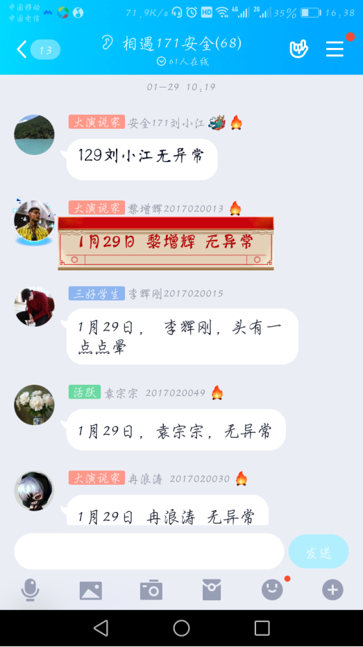 现在,我们会每天督促同学们用完美校园APP健康打卡,如果有出行等情况,就会以文字形式上报。