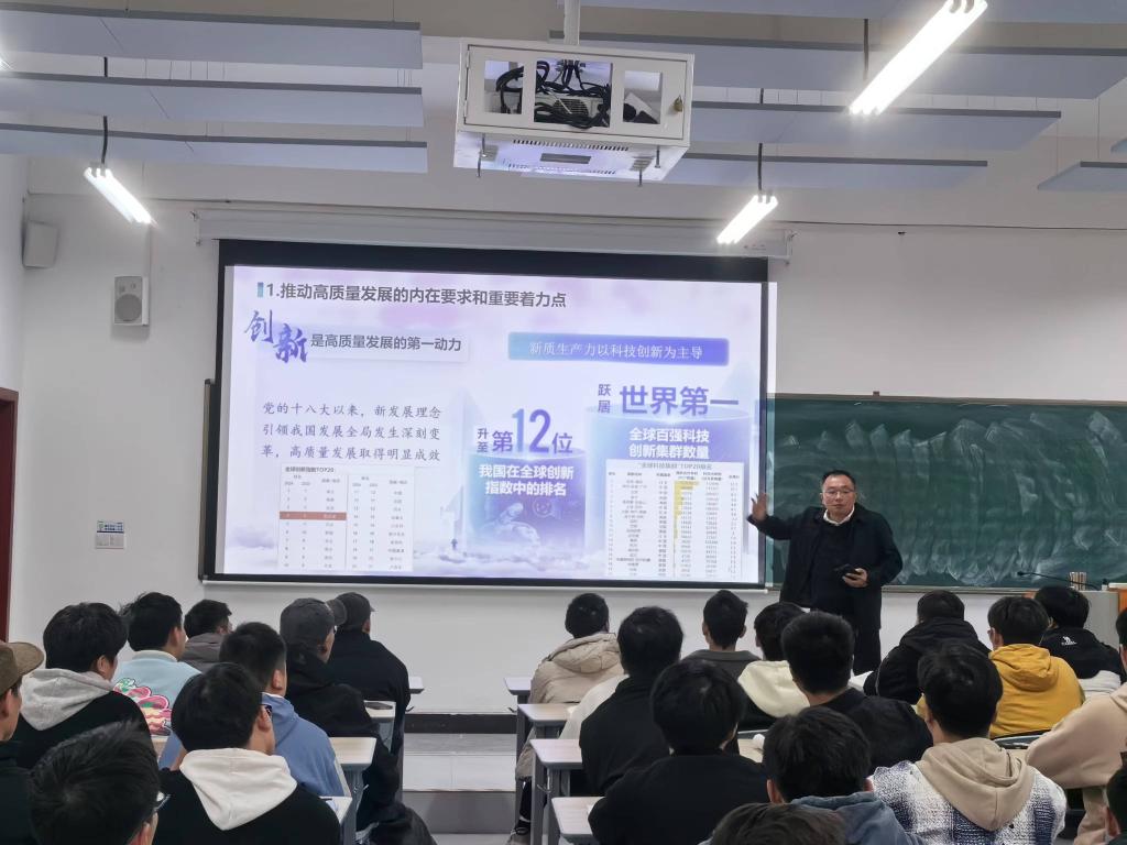 潘良明为同学们梳理了自古代社会,经工业革命至近代以来的社会生产力发展脉络,围绕“事关全局的国之大者”“创新质优的质态特征”“统筹推进的系统工程”三个方面悉心授课,结合生动案例,为同学们分析阐释了什么是新质生产力、为什么必须发展新质生产力、如何发展新质生产力,帮助同学们更为清晰、全面地认识到,新质生产力是符合新发展理念的先进生产力质态,是由技术革命性突破、生产要素创新性配置、产业深度转型升级而催生,对劳动者提出了更高素质的要求,鼓励同学们扩大知识面,学习更加高、精、尖的知识,振奋精神,强健体魄,更好地适应新质生产力发展需要。