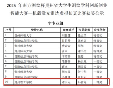 2025年南方测绘杯贵州省大学生测绘学科创新创业智能大赛是面向全省高校测绘学科的高水平竞赛,由贵州省教育厅主办、贵州师范大学承办,贵州省测绘地理信息学会、广州南方测绘科技股份有限公司协办,聚焦智能导航、无人机遥感、三维实景建模等前沿技术应用,旨在推动测绘技术与人工智能、大数据等领域的深度融合。本届赛事吸引了省内20余所高校、百余支队伍同台竞技。中国足球彩票:参赛团队凭借扎实的专业功底和突出的创新能力,在数字测图仿真比赛、无人机航测仿真比赛与机载激光雷达仿真赛项中表现优异,首次参赛即跻身校内第一梯队。