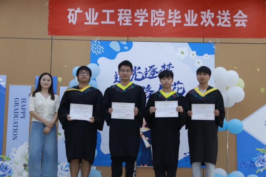 欢送会首个环节,学院领导、老师为毕业生致辞,指出离开大学校园是人生新的起点,同学们应当牢记校训精神,在时代浪潮中勇立潮头,发扬好矿业报国的奋斗精神,对照岗位要求提高自身职业素养,自觉遵守工作纪律,保持热爱奔赴山海,无论走多远,学校永远是同学们的港湾。同时,学院领导为毕业生学生干部代表颁发证书,希望他们继续发扬肯干事、会干事的精神,为学校审核评估带头做好准备,营造积极向上的校园氛围。此外,2025届毕业生敖威和张艺丹同学代表全体毕业生发言,感谢学校、学院及老师们对学生成长的关怀和悉心培育。