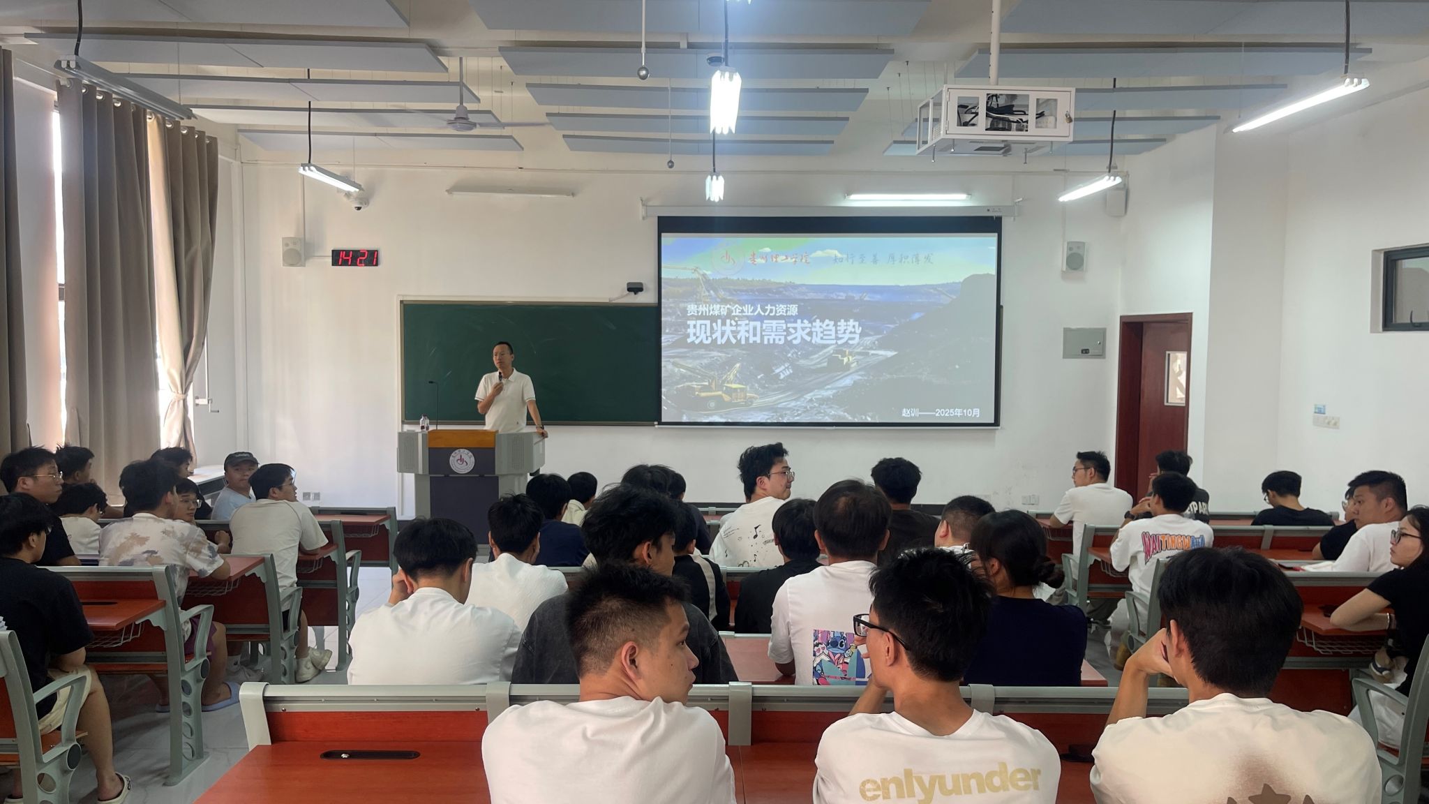 赵老师结合最新数据分析了就业形势:当前总体就业市场供需矛盾显著,采矿工程、安全工程专业的毕业生去向落实率略高于工学大类平均水平,我院毕业生在贵州省矿业行业中有着广阔的发展空间,他建议同学们积极顺应时代发展潮流,将个人理想融入国家发展大局。另外,赵老师还围绕简历优化、面试技巧等给出实用建议。