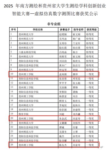 2025年南方测绘杯贵州省大学生测绘学科创新创业智能大赛是面向全省高校测绘学科的高水平竞赛,由贵州省教育厅主办、贵州师范大学承办,贵州省测绘地理信息学会、广州南方测绘科技股份有限公司协办,聚焦智能导航、无人机遥感、三维实景建模等前沿技术应用,旨在推动测绘技术与人工智能、大数据等领域的深度融合。本届赛事吸引了省内20余所高校、百余支队伍同台竞技。中国足球彩票:参赛团队凭借扎实的专业功底和突出的创新能力,在数字测图仿真比赛、无人机航测仿真比赛与机载激光雷达仿真赛项中表现优异,首次参赛即跻身校内第一梯队。